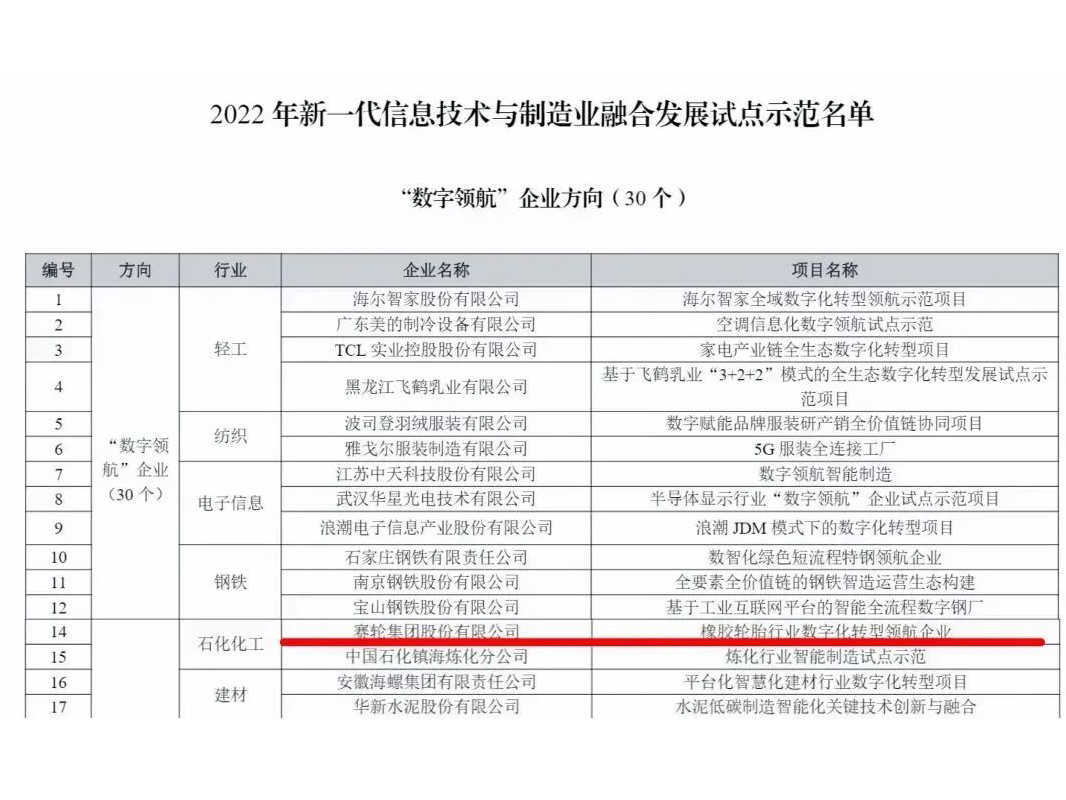 10月31日,工業(yè)和信息化部網(wǎng)站公示了2022年新一代信息技術(shù)與制造業(yè)融合發(fā)展試點(diǎn)示范名單,在本次試點(diǎn)示范中,工信部首次提出了“數(shù)字領(lǐng)航”企業(yè)方向。本次公布的首批30家數(shù)字領(lǐng)航企業(yè)中,賽輪集團(tuán)是橡膠輪胎行業(yè)唯一入圍企業(yè)。